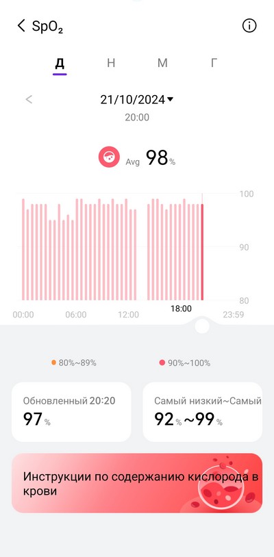 Уровень оксигенации тоже измерял более или менее нормально - все время показывал 96-99%. Здесь также есть постоянный мониторинг этого уровня.