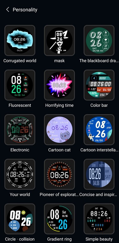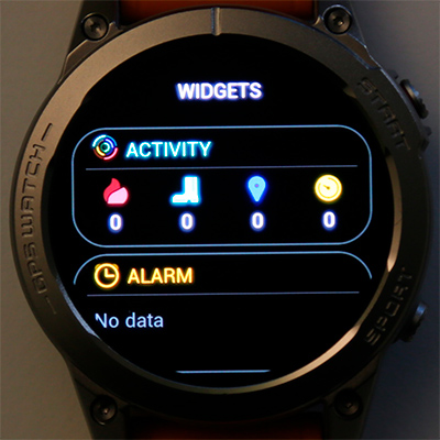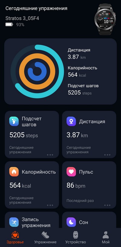 Свайп влево-вправо: там идет карусель приложений с сердечным ритмом, стрессом, уровнем оксигенации, отслеживанием сна, а также целый набор виджетов, где можно посмотреть отслеживание активности, будильник, погоду и те же пульс, стресс, сон и так далее.