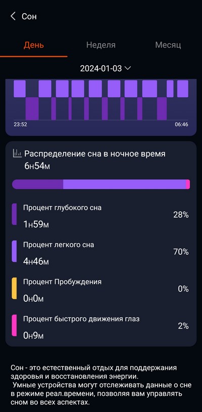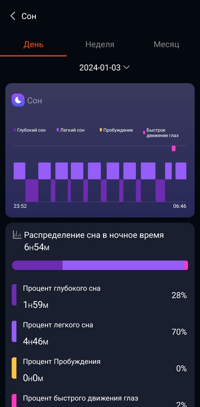 Мониторинг сна делался хорошо. Просыпания/засыпания отслеживали нормально, даже несколько лучше, чем мои Samsung Galaxy Watch5 (у них с просыпаниями традиционная проблема: часто не фиксируют дальнейший сон).