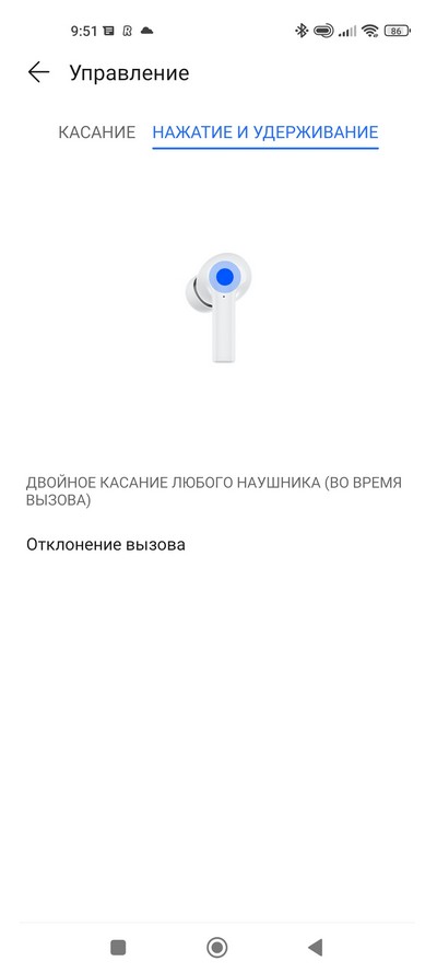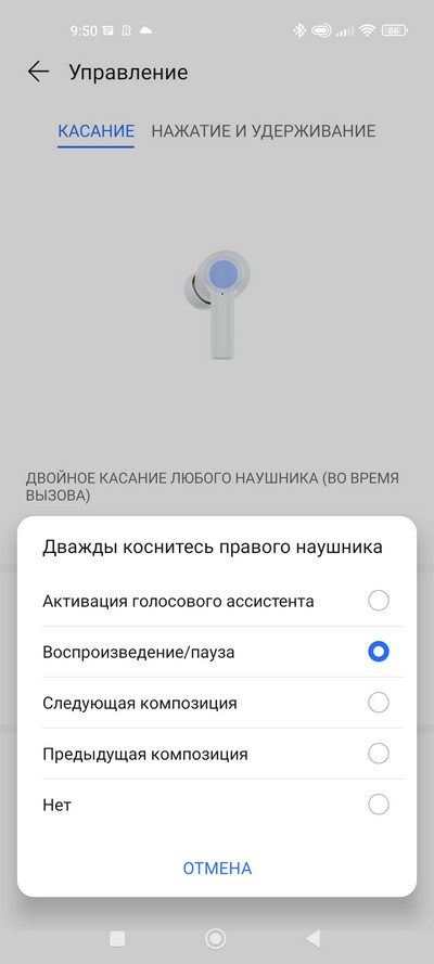 Управление и настройка управления для правого и левого наушников. Регулировки звука с наушников нет, но можно вызвать ассистента и попросить его поменять уровень звука.
