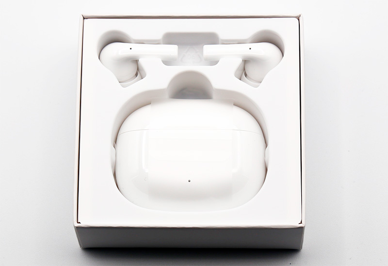 Внутри - редкий случай - наушники лежат отдельно, а не в зарядном кейсе. В одном из обзоров высказали предположение, что это, мол, для того, чтобы наушники не разряжались. Как они могут разряжаться в зарядном кейсе - обозреватель так и не пояснил.