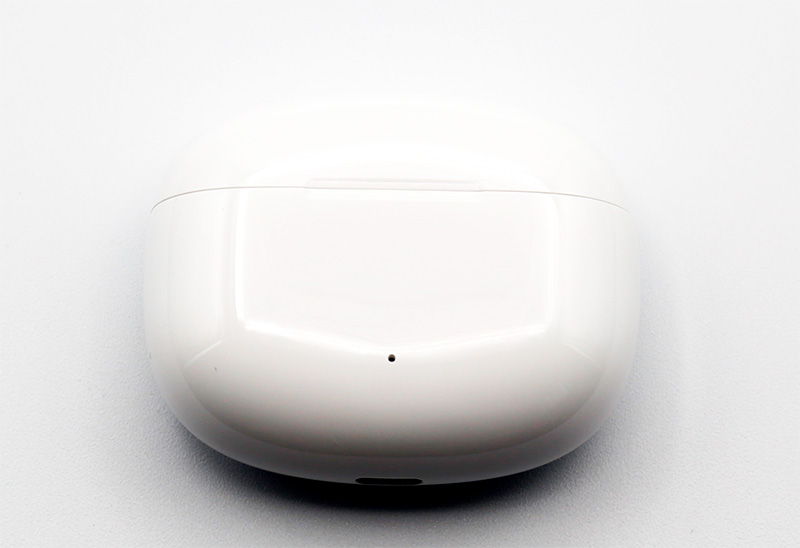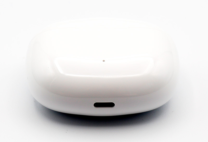 Зарядный кейс из глянцевого пластика. Крышка - на магнитах. На передней части кейса внизу расположен светодиод, демонстрирующий процесс зарядки наушников и кейса.