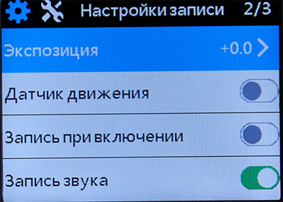 Есть корректировка экспозиции, включение датчика движения - для автоматического включения видеорегистратора в режиме парковки: при отсутствии движения запись через 10 секунд выключится.