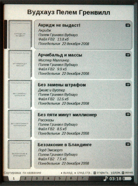 По умолчанию идет сортировка по названию. Страницы можно листать джойстиком. Папки (обычно одна папка - один автор) открываются кнопкой ОК, но если ее нажать и удерживать - появляется меню, в котором можно выбрать вид представления книг (список, эскизы, подробная информация), вид сортировки (по названию, по автору, по именам файлов), а также, что уж совсем экзотика, можно вызвать поиск книги по автору или названию.