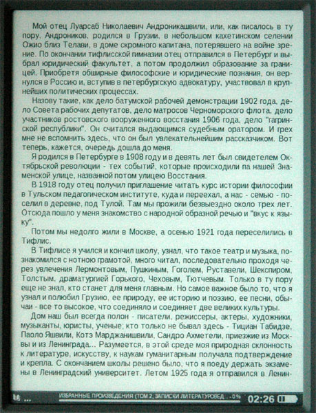 На какое количество перелистываний страниц рассчитан аккумулятор, я, к сожалению, толком и не выяснил. Производитель обещает 8000 перелистываний. В единственном обзоре, выложенном на сайте, приводятся более чем странные данные - дескать, время работы от полного заряда составило 36 полных суток. Данные потрясающе интересные, хотя и совершенно бесполезные. У электронной бумаги энергия тратится только в момент перелистывания страницы (ну, точнее, в момент вывода информации на экран). Если ничего не листать (и не запускать плеер, разумеется), энергия не тратится. Поэтому 36 суток, 6 суток или 256 суток - это ни о чем не говорит. Вы лучше скажите, на сколько перелистываний реально хватает аккумулятора - тогда хоть что-то будет понятно.