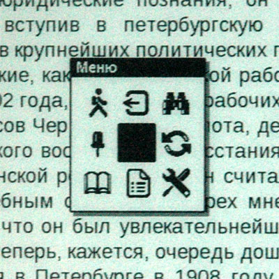 Пиктограммы в меню следующие: переход на заданную страницу (номер задается через удобную экранную клавиатуру), выход из меню, поиск нужной строки (через экранную клавиатуру, которую мы уже рассматривали), поворот экрана (направление поворота можно выбирать, причем вы можете расположить текст вверх ногами - в этом случае устройство будет удобно держать левой рукой и листать страницы джойстиком), установка и вызов закладок, вызов словаря, вызов оглавления и настройки.