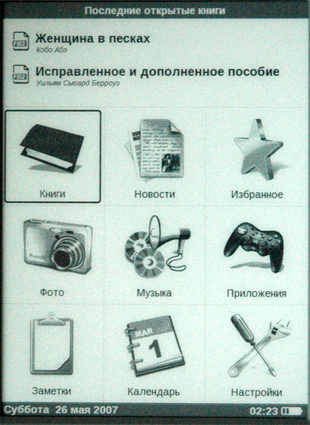 Главное меню Pocketbook 301 весьма информативно. Сверху - две последние открытые книги, ниже - пиктограммы всевозможных сервисов, предоставляемых устройством: чтение книг, чтение RSS-лент, избранные книги, просмотр изображений, прослушивание музыки, приложения (игры, часы, калькулятор), заметки, календарь, настройки.