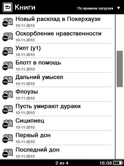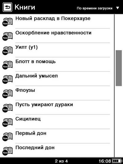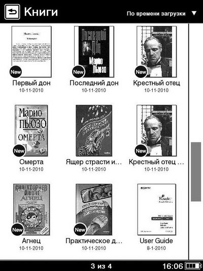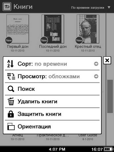 Там интереснее всего режим отображения книг. По умолчанию выводятся обложки. Вы можете также задать режим списка и только название. Второй режим отличается от первого тем, что там не указывается дата файла и название может выводиться в две строки.
