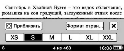 Гарнитуру шрифта вы менять не можете (но имеющийся шрифт лично меня устраивает на все сто), а размеров предлагается шесть вариантов. (Понятно, что в форматах со встроенными шрифтами гарнитура этого шрифта и выводится, но, например, в LRF, в который шрифт не встраивался, гарнитуру шрифта вы также сменить не можете.)