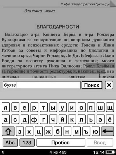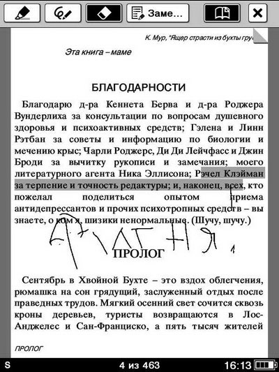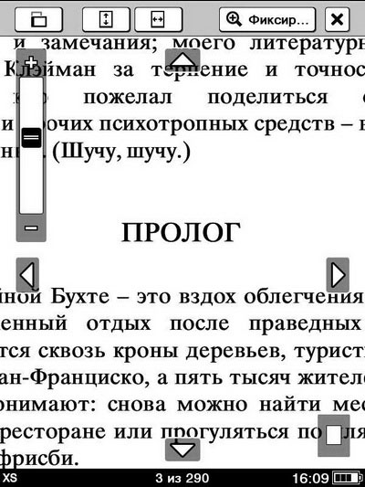 Листание страниц производится или кнопками (удобно использовать только тогда, когда держишь ридер в левой руке), или проведением пальцем по экрану - горизонтально или вертикально. В старых ридерах с сенсорным экраном устройство плохо реагировало на проведение пальцем - срабатывало далеко не с первого раза. В этом ридере чувствительность хорошая и устройство реагирует очень четко. Держать ридер в правой руке и проводить большим пальцем по экрану получается без каких-либо проблем.