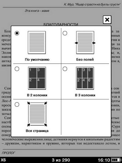 Это, собственно, тоже настройки масштабирования: уложить страницу в размер экрана, уложить в размер по горизонтали, разместить страницу на 4 или 6 экранов. Для обычного текста это совершенно неактуально, а вот для PDF вполне может пригодиться. Если включается двух- или трехколоночный сплит, то навигационные стрелки не появляются, а по частям страницы перемещение идет слева направо сверху вниз кнопками или жестами листания.