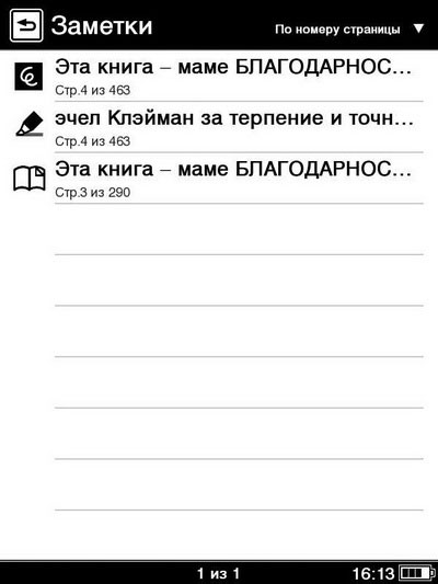 Если не включен режим невидимости заметок, то при чтении они видны на экране. В списке заметок можно посмотреть номера страниц и узнать тип: выделение маркером или рукописная надпись.