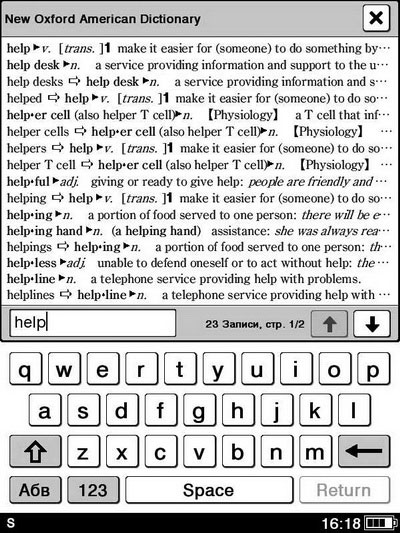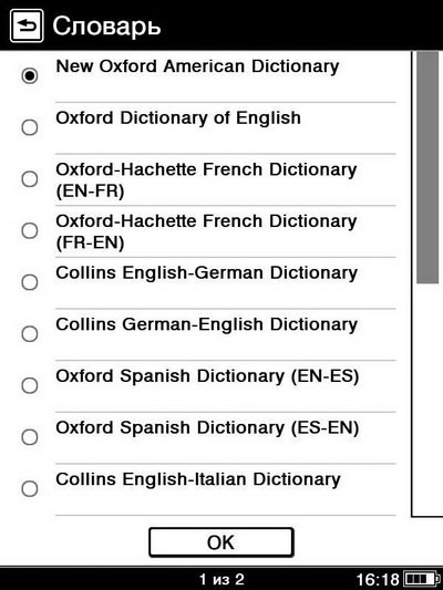 А вот словарь - реально полезное приложение. По умолчанию включен New Oxford American Dictionary, но, как я понимаю, можно подключать и другие словари. Кроме того, в комплект входят еще 11 словарей - французские, немецкие, испанские, итальянские и голландские. Выбрать нужный словарь можно в настройках устройства.