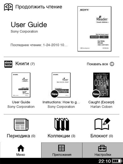 Сверху идет ссылка на читаемую книгу. Далее - библиотека, где выводятся три последних издания. Ниже - ссылки на периодику, коллекции (там по умолчанию включены три коллекции - непрочитанные книги, непрочитанная периодика, купленные книги) и закладки.