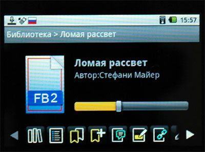 Здесь выводятся пиктограмма формата книги, ползунок листания страниц и пиктограммы всевозможных сервисов: возврат в библиотеку, оглавление, закладки, поставить закладку, поставить голосовую закладку, пометить маркером, отправить ссылку, изменить настройки текста, добавить в фавориты, сделать текстовую пометку, поискать в словаре.