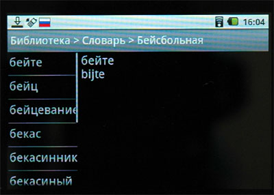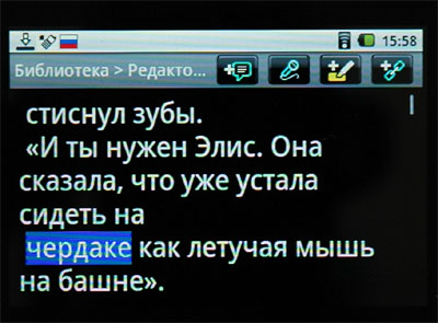 Поиск по тексту работает хорошо - с помощью экранной клавиатуры удобно вводить подстроку для поиска. Также можно искать значения набранных или выделенных слов во встроенном словаре.