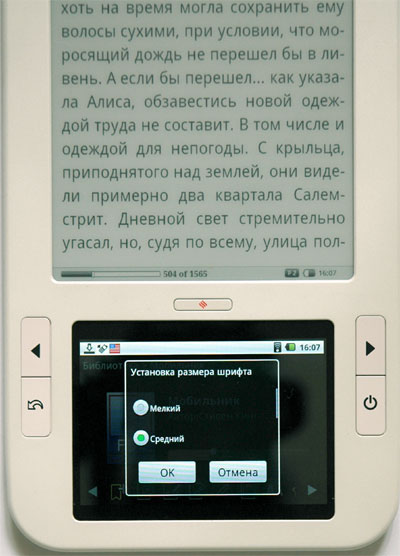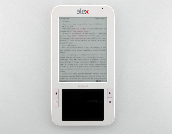 Открываем выбранную книгу. На верхнем дисплее появляется текст, который можно читать, листая страницы - как на обычном ридере. Производители устройства нигде не пишут, какой именно дисплей E-Ink они устанавливают, но, судя по всему, тут используется обычный VizPlex третьего поколения, который на данный момент считается уже слегка устаревшим (после выхода Sony PRS-350, PRS-650, PRS-950 и Amazon Kindle 3 и Kindle DX).