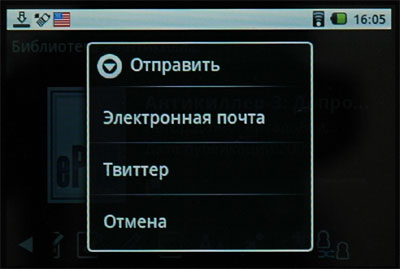 Пиктограмма "Отправить" предлагает отправить название книги в электронную почту или Twitter из серии "Я читаю учебник для второго класса по русскому языку и вам рекомендую".