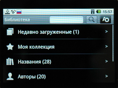 При входе в библиотеку вам предлагают сортировать книги по недавно загруженным, фаворитам, названиям, авторам.