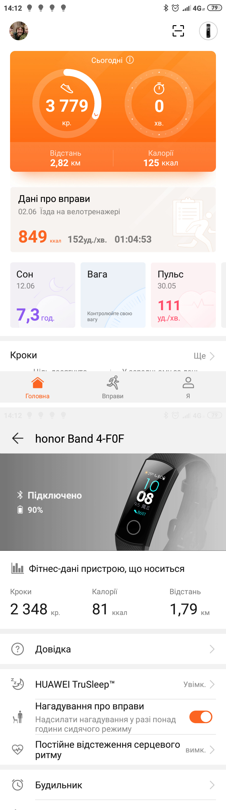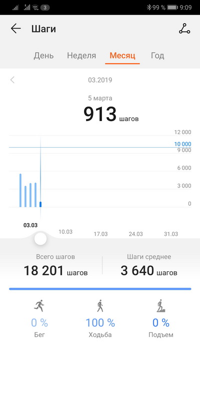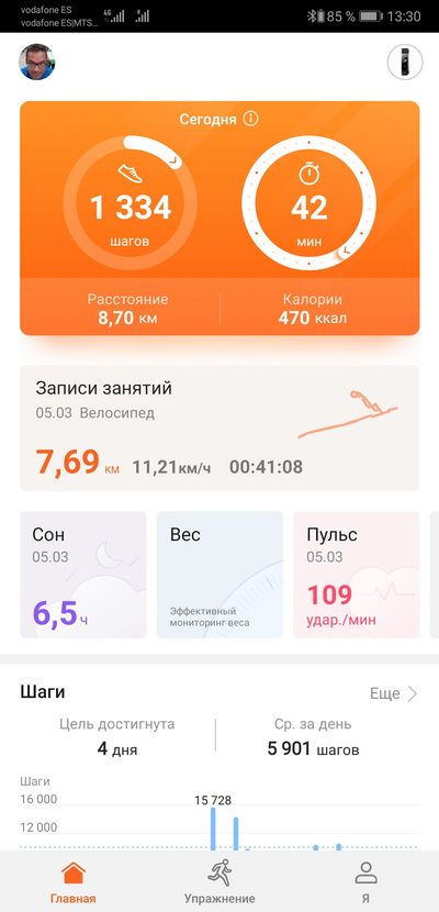 Очень непонятно работает родное приложение Huawei. Оно каким-то странным образом суммирует шаги самого шагомера и свои. Причём, чем больше шагов, тем большее расхождение. Иногда кажется, что просто тупо складывает шаги, которые меряет приложение с шагами, которые намерял трекер, и получается примерно в два раза больше, чем реально прошёл. Иногда, всего показывает процентов на 50-60 больше. Очень неудобно, так как не получаю реальной статистики. Вот пример сегодня, расхождение в 1400 шагов.