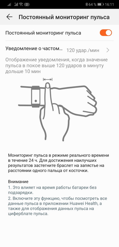 Мониторинг пульса, включение режима уведомления (границу можно устанавливать самому).