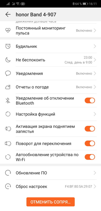 Есть один умный будильник и еще четыре обычных, режим "Не беспокоить", уведомления об отключении от смартфона, активация браслета поднятием запястья, поворот для переключения ориентации экрана.