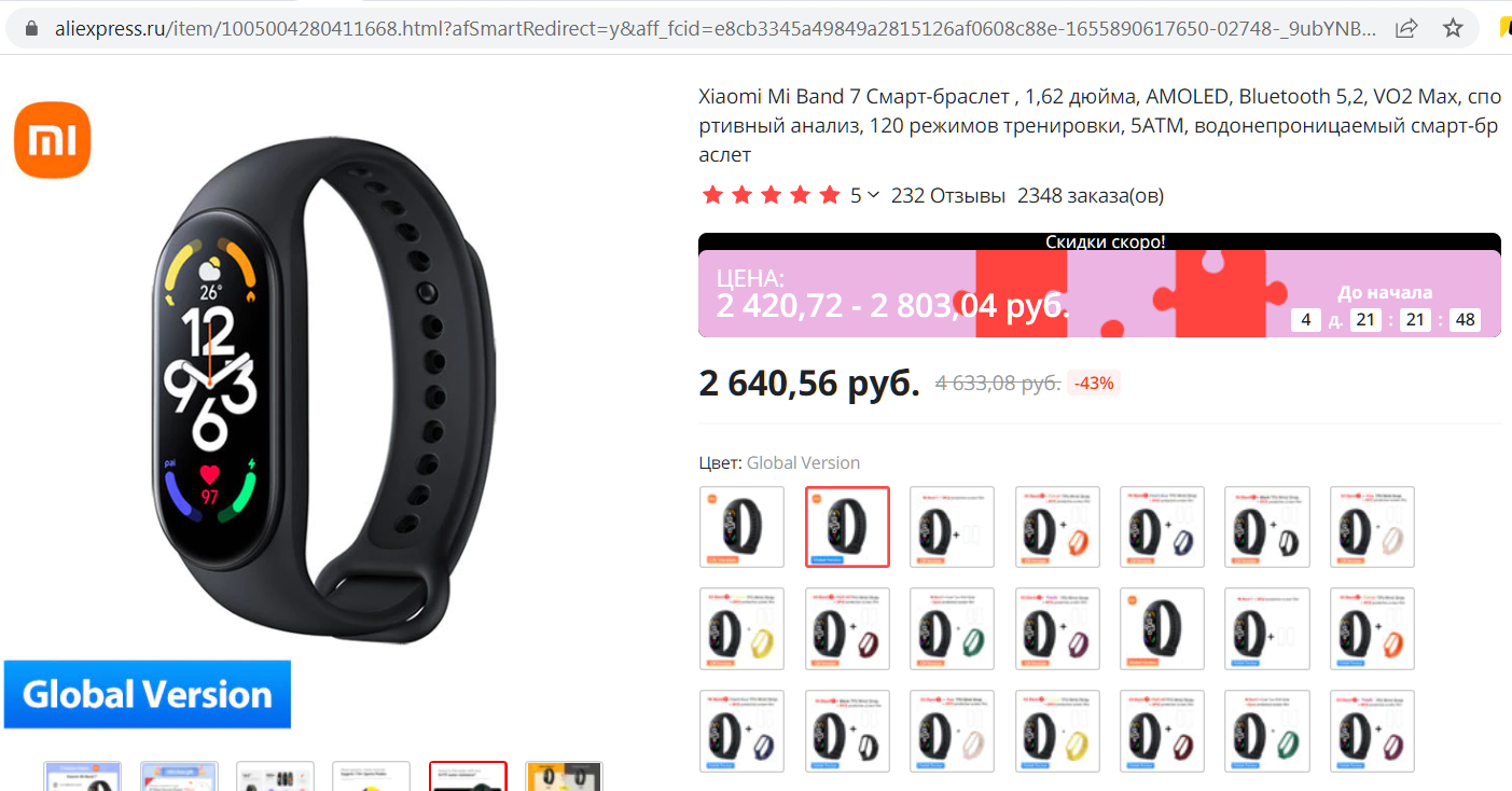 P.S. Для моих читателей магазин дал эксклюзивный купон на скидку BAND045 (срок действия с 27.06.2022 по 01.07.2022). Также они просили сообщить, что 27 июня в этом магазине состоится специальная акция со скидками на Mi Band 7: окончательная цена при этом составит 36,99$ (версия для CN) и 38,99$ (глобальная версия). Внимание: при покупке обращайте внимание на версию - там одновременно есть китайские версии и глобальные.