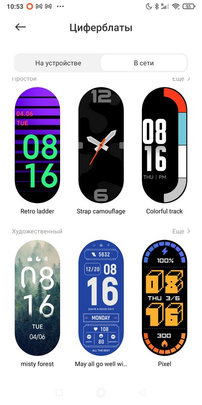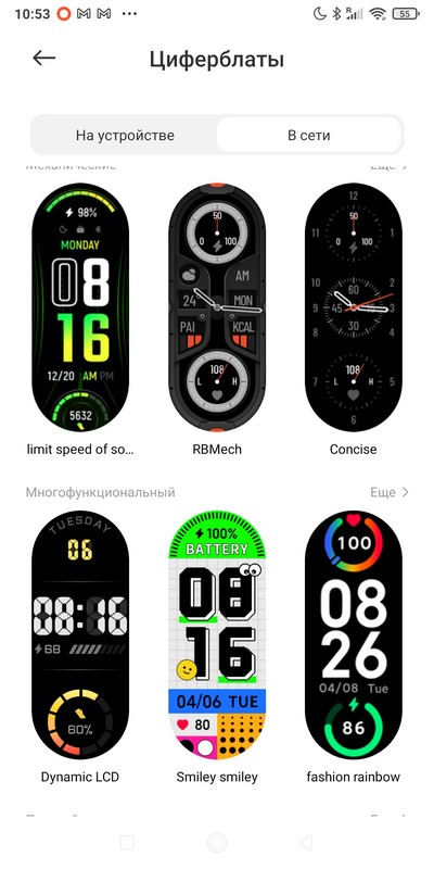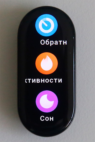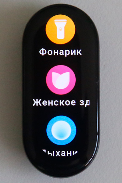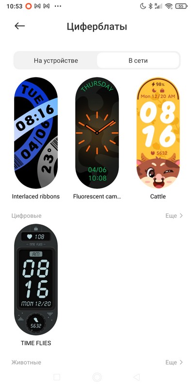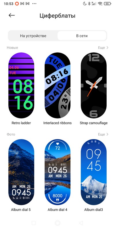 Главный десктоп - он же циферблат. Циферблат меняется длинным нажатием на экран (в памяти браслета их хранится пять штук) или в приложении. Здесь есть режим AOD (постоянно включённый экран), и он свой у каждого конкретного циферблата. Вот этот режим для данного циферблата.