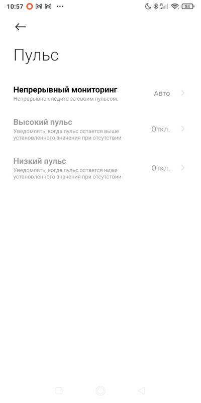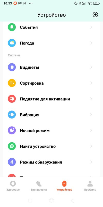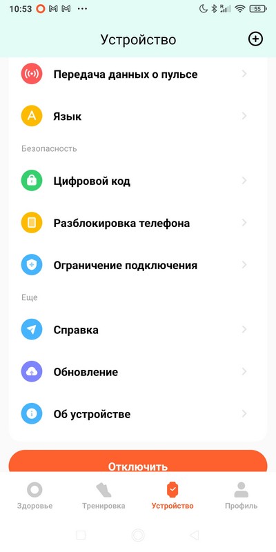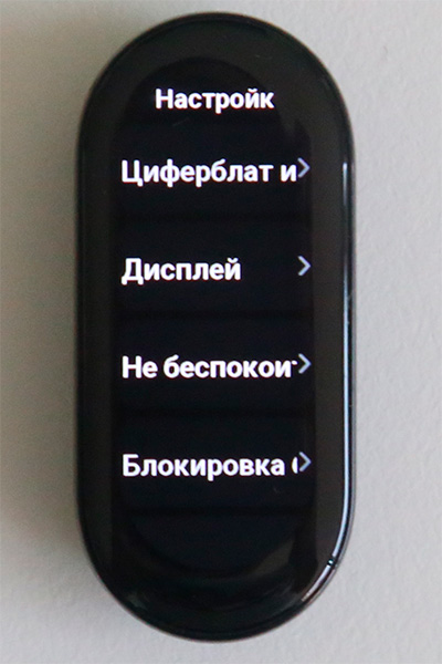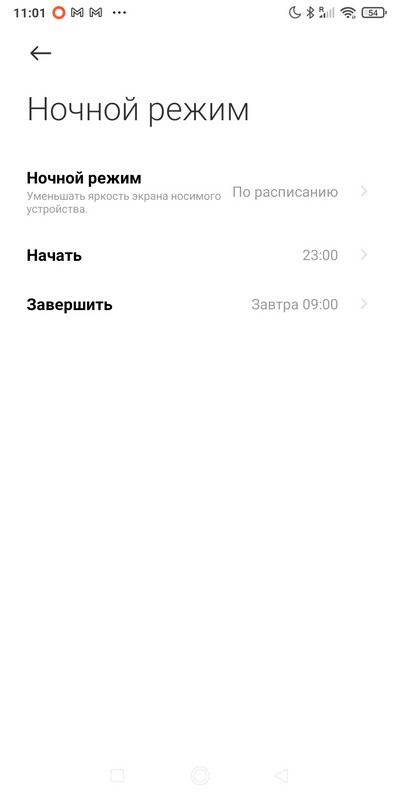 В настройках можно задавать яркость дисплея (автоматической подстройки тут нет), включение режима "Не беспокоить" или задание его расписания (внимание, это включается только в самом браслете, не в приложении!), задать секунды до отключения циферблата, задать расписание автоматического включения экрана, сделать сброс браслета или перезагрузить его.