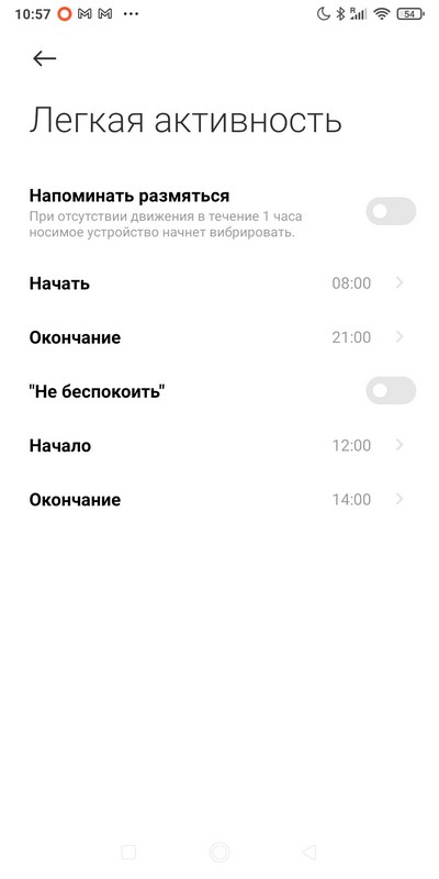 Из каких-то глюков я заметил только один: даже при отключенном напоминании о необходимости размяться в приложении на смартфоне это предупреждение все равно срабатывало на трекере. Особенно "приятно" было, когда это предупреждение срабатывало вибрацией во время сиесты. Но я нашел способ с этим справиться: нужно было включить это напоминание, также включить работу по расписанию и выставить период, например 09:00 - 09:01. И напоминать перестало.