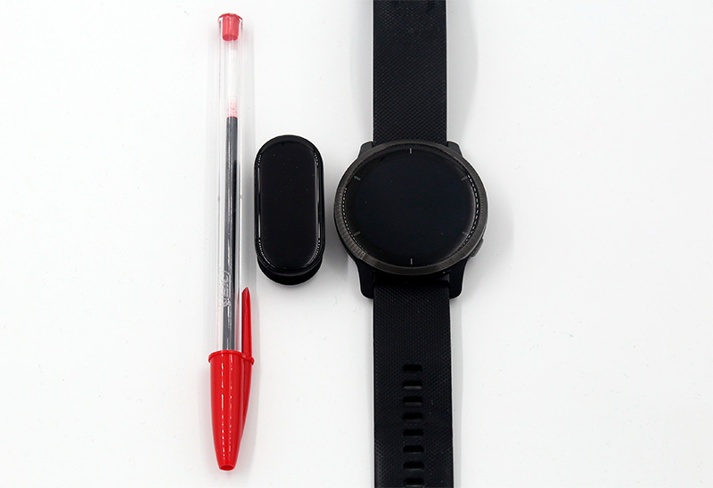 Ну и вот он рядом с типовой ручкой для оценки размеров. Справа - мои нынешние умные часы Garmin Venu 2.