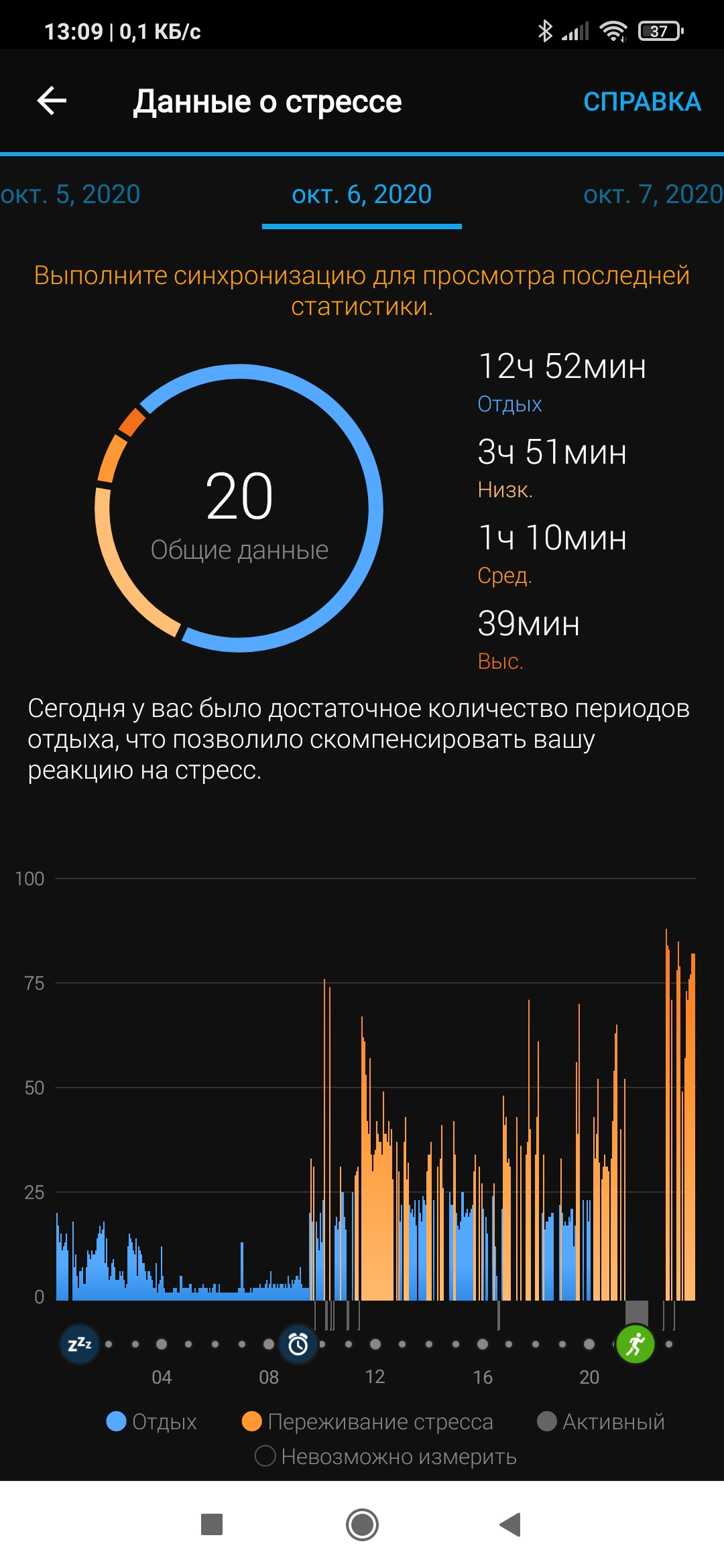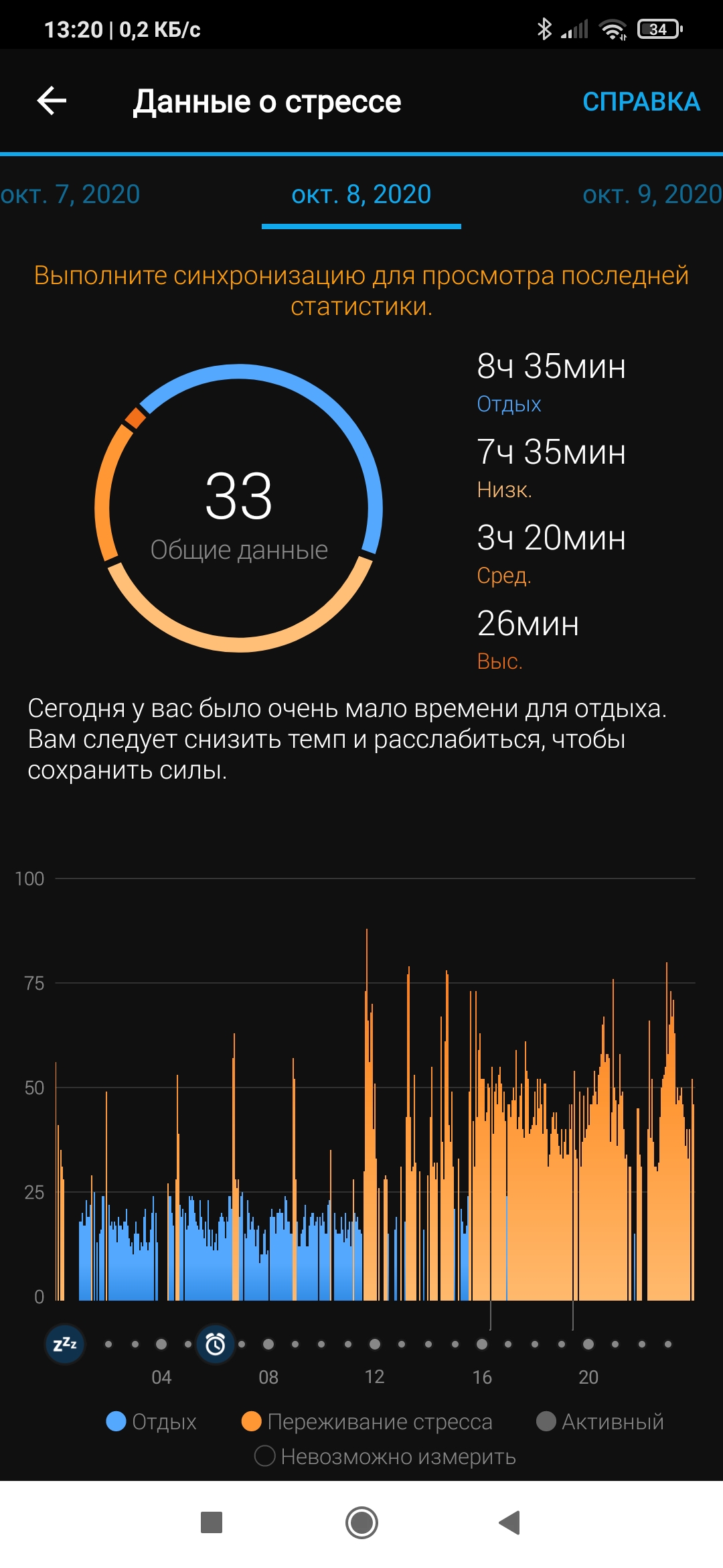 Продолжение. Следующий день. Виден высокий уровень стресса во сне и в течение всего дня. Чувствовал себя нормально до самого вечера. Вечером расчихался и начало знобить. Дома после работы измерил температуру 37.8
