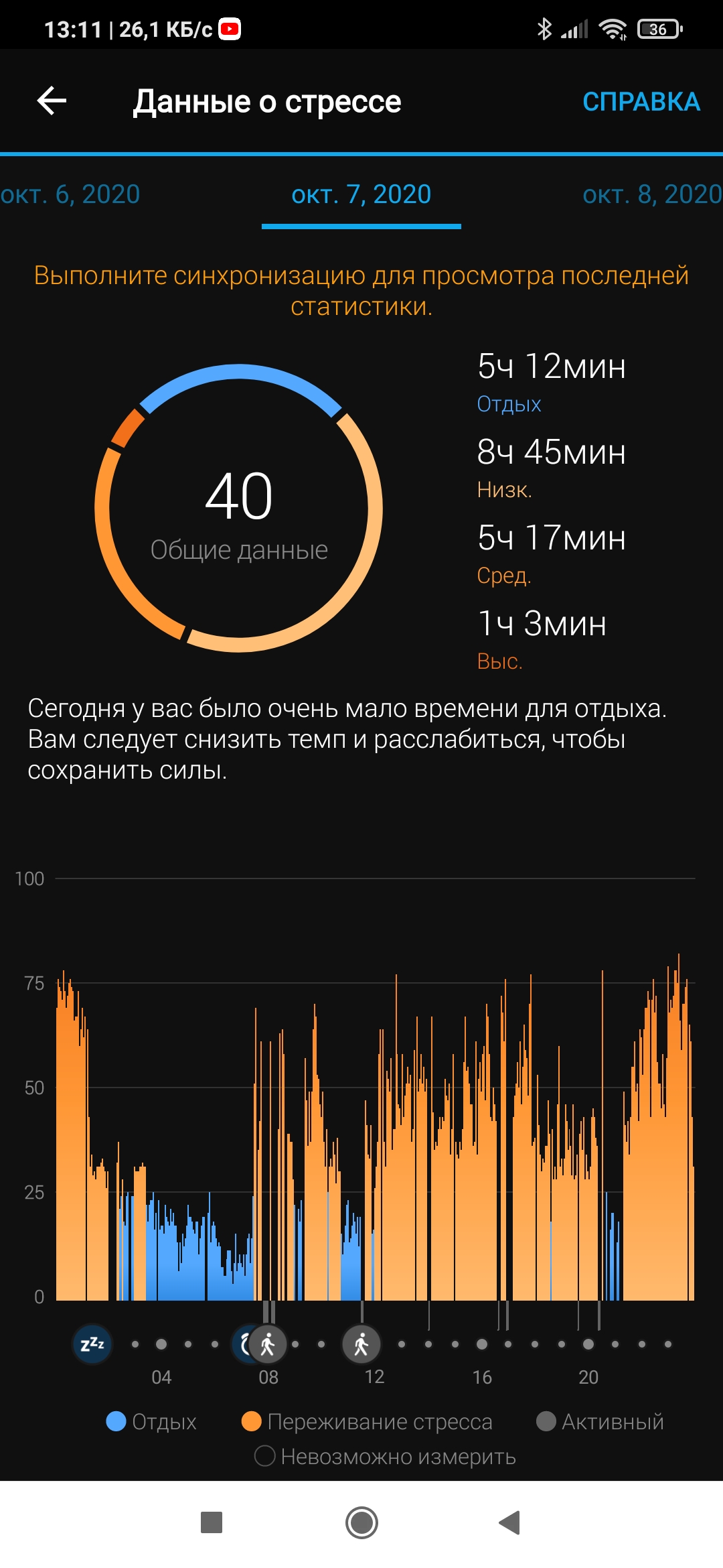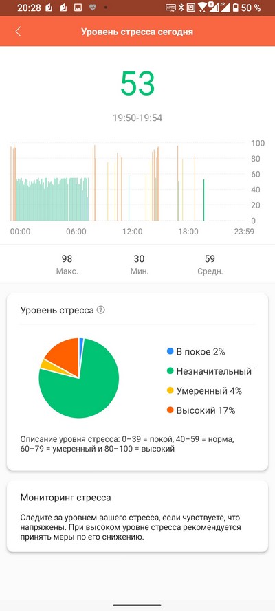 И с уровнем стресса во сне непонятно. Если Xiaomi намерили 55, а Garmin 25, то даже с учетом разных шкал измерения результат Xiaomi ни о чем.