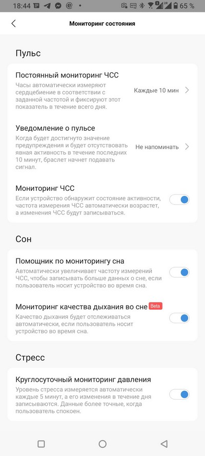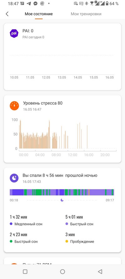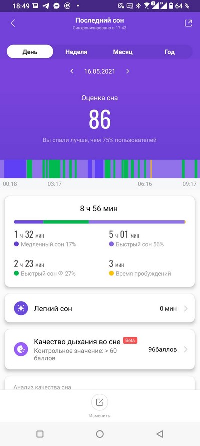 Отслеживание сна по ощущениям стало точнее, чем в предыдущей модели: эта у меня уже нормально определяла пробуждения, а раньше с этим были проблемы. Однако дневной сон (сиесту) по-прежнему не фиксирует, также меня несколько раздражает то, что информацию о сне нельзя увидеть на браслете (у умных часов Amazfit, которые выпускает та же компания Haumi, которая для Xiaomi делает эти браслеты, это тоже увидеть нельзя), только в приложении.