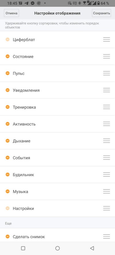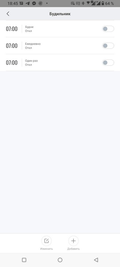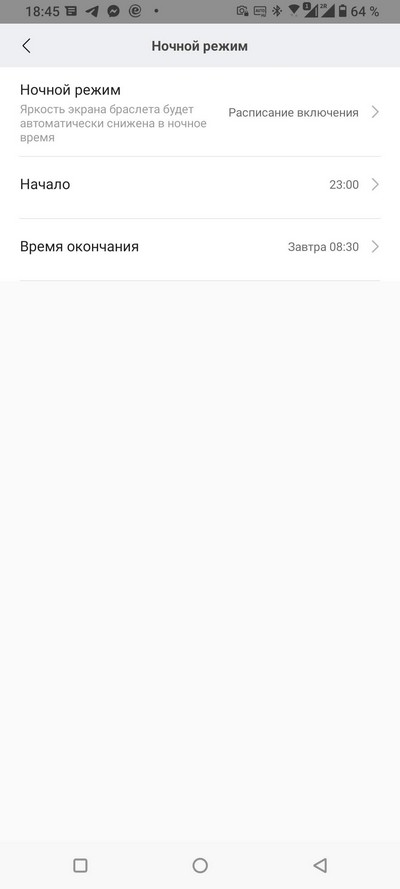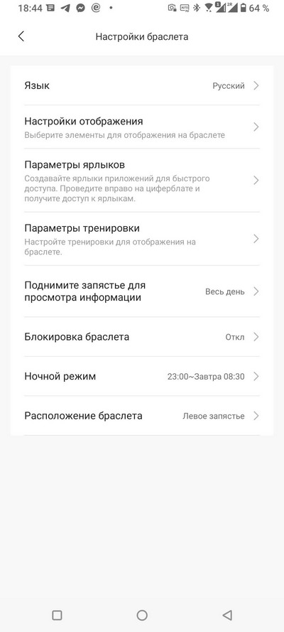 В настройках можно задавать яркость дисплея (автоматической подстройки тут нет), включение режима "Не беспокоить" или задание его расписания (внимание, это включается только в самом браслете, не в приложении!), задать секунды до отключения циферблата, задать расписание автоматического включения экрана, сделать сброс браслета или перезагрузить его.