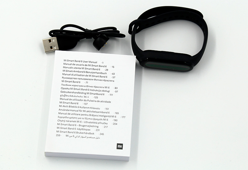 Комплект поставки: фитнес-браслет с ремешком, кабель для зарядки, инструкция на многих языках, включая русский, куда вы совершенно точно не заглянете ни разу.