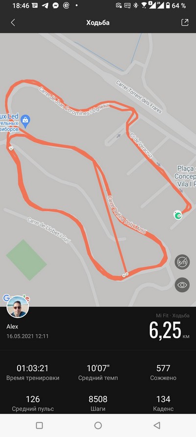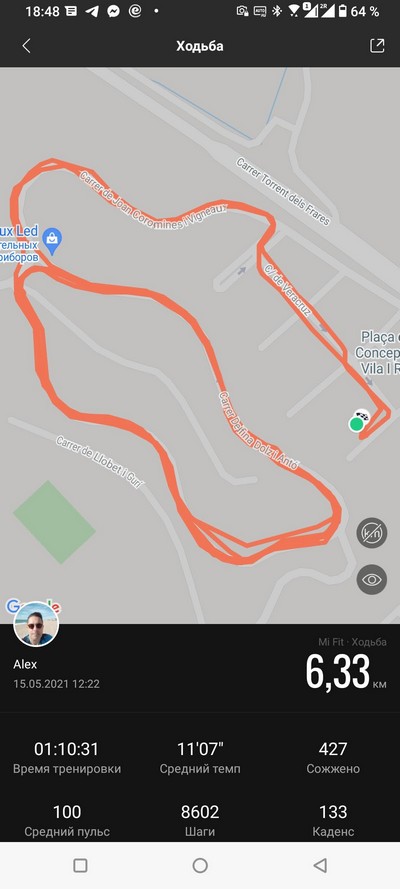 Тренировка, запущенная со смартфона. Маршрут определен абсолютно точно, трекинг правильный. В нижней части трекинга слегка меняется маршрут - это нормально: я там могу идти то по обочине дороги, то по тротуару.