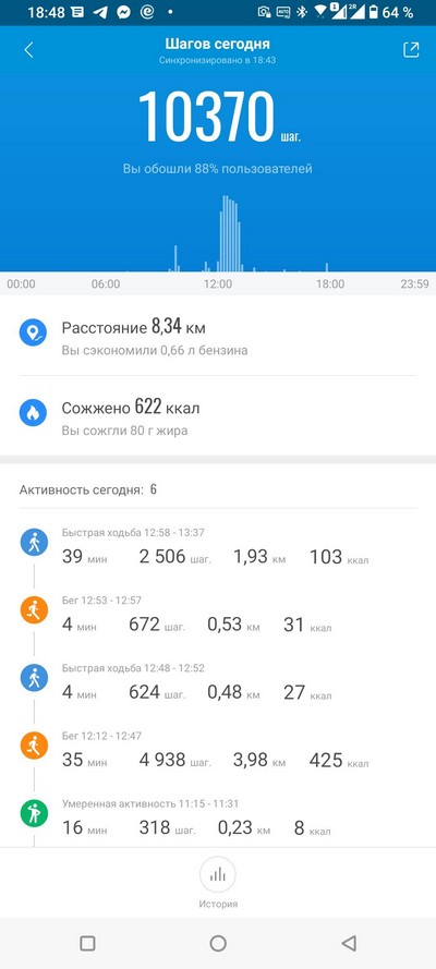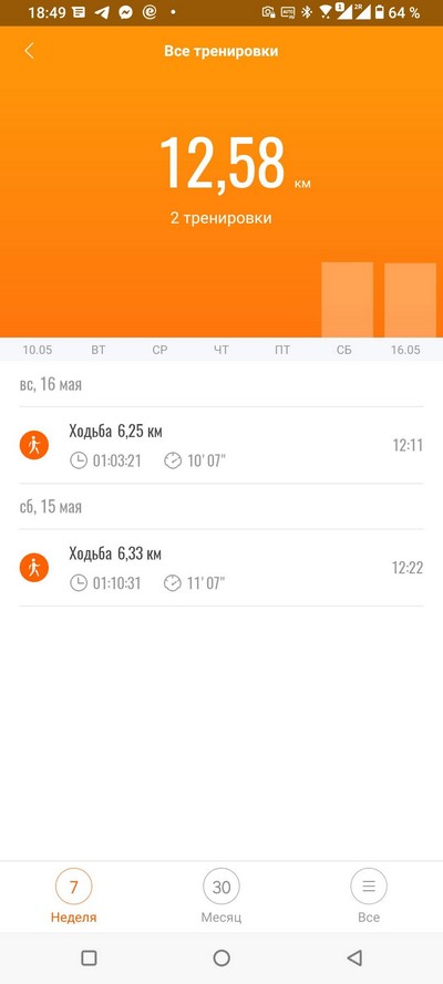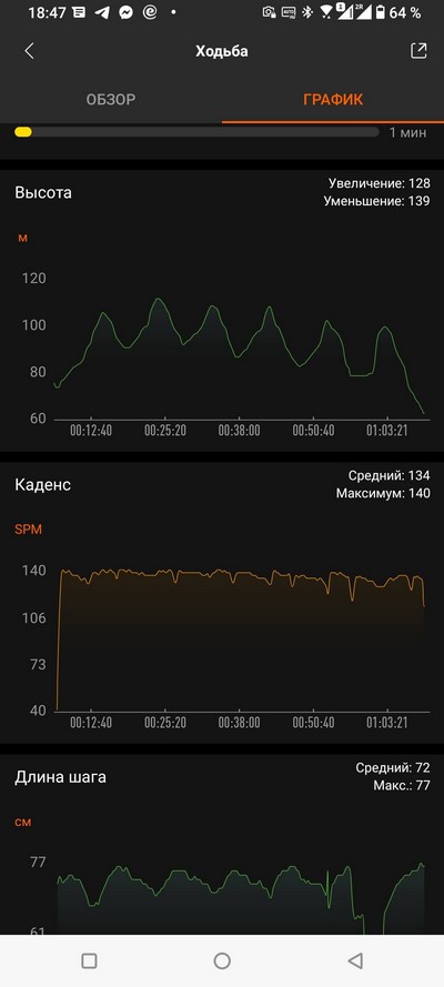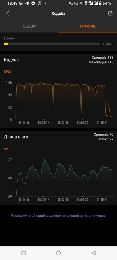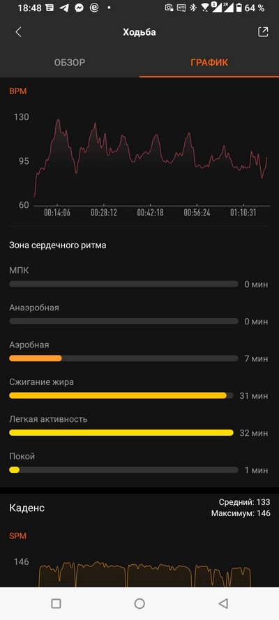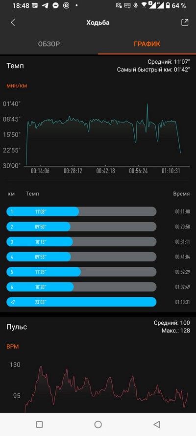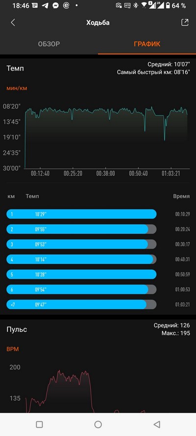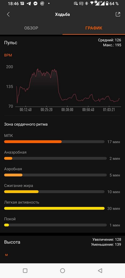С пульсом на скриншоте ниже браслет явно налажал - не могло там быть пульса под 180: видимо, из-за того что запястье было влажное, с измерением там частично какая-то лажа.