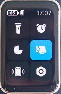 По свайпу вправо появляются быстрые переключатели, уровень заряда и время. Переключатели следующие: фонарик, будильник, режим "не будить", активация поднятием запястья, поиск смартфона, настройки.