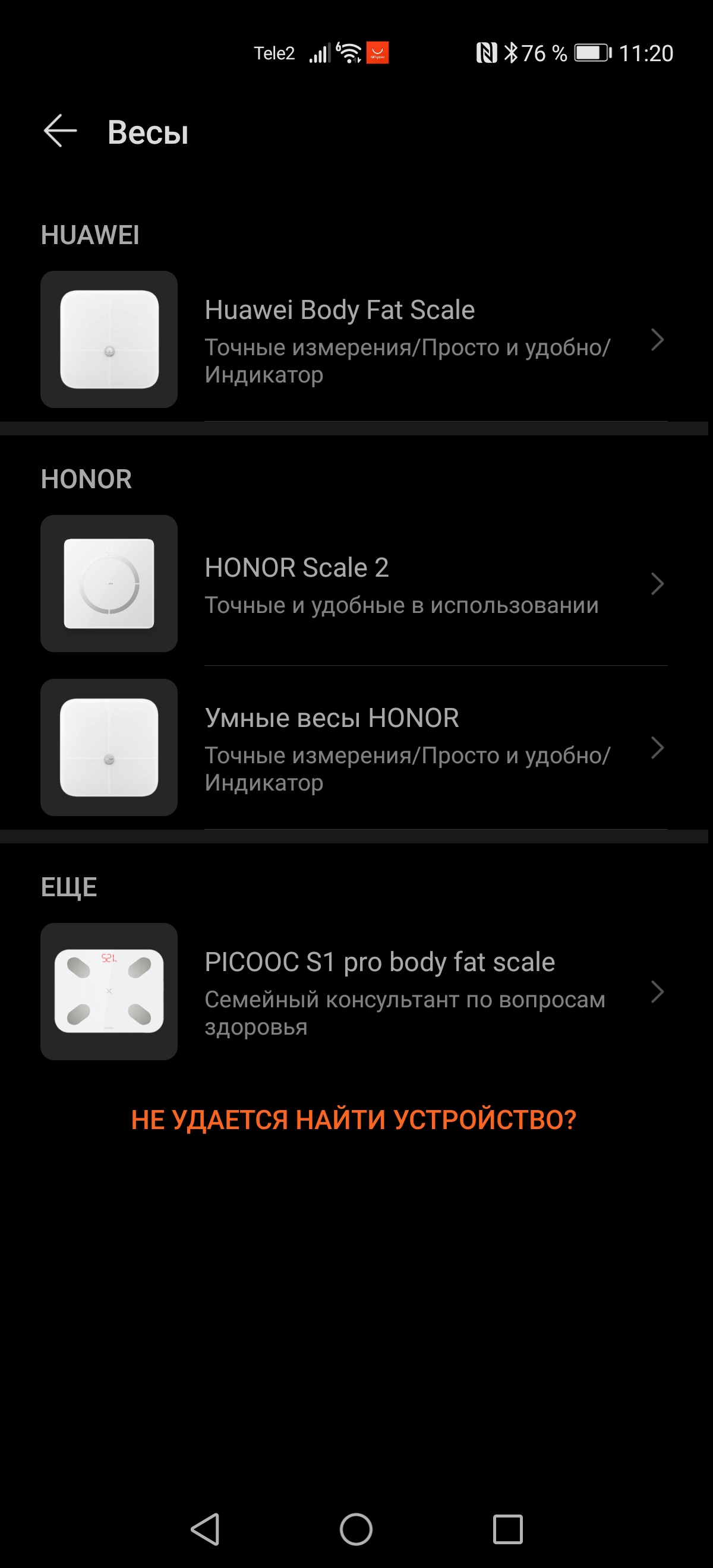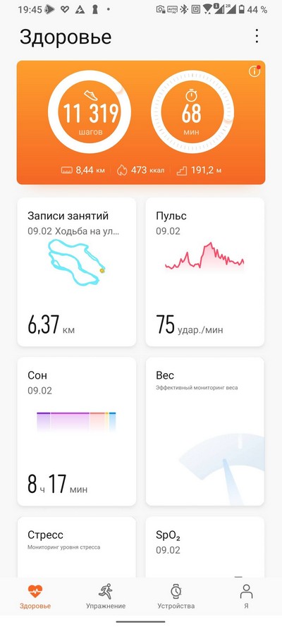 Главный экран приложения. Основные информеры: шаги, активность, различные данные, тренировка, пульс, сон, вес. Для измерения веса можно подключить весы Huawei, Honor или Picooc S3.