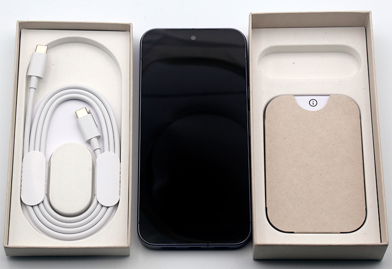 Комплект поставки: смартфон, кабель для зарядки, инструмент для вытаскивания вставки под симкарты.