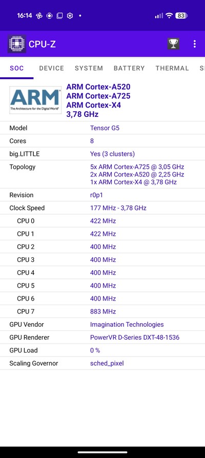 Процессор: Google Tensor G5 (3 nm), Octa-core (1x3.78 GHz Cortex-X4 & 5x3.05 GHz Cortex-A725 & 2x2.25 GHz Cortex-A520)