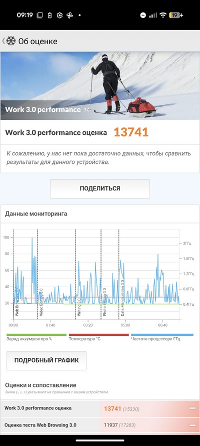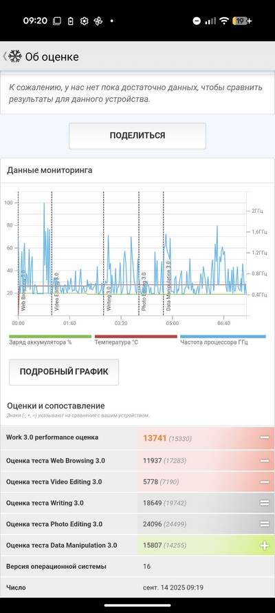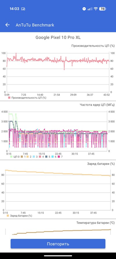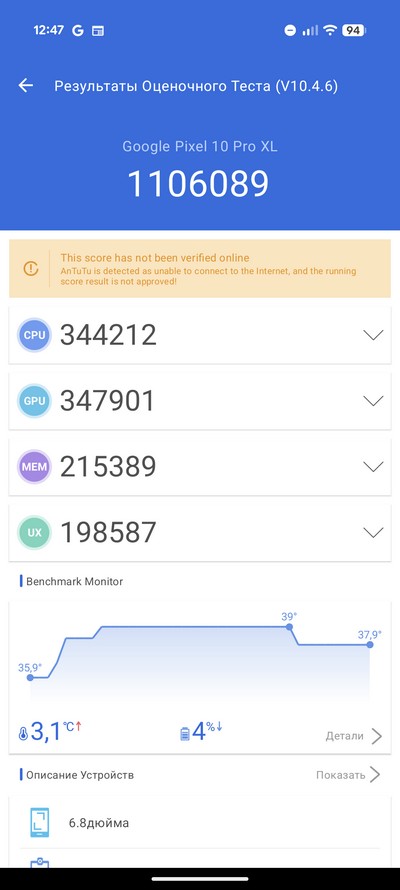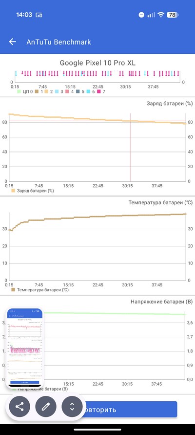 Синтетический тест PCMark. Тест продолжался в районе 14 часов (у меня получилось 14 часов 15 минут), однако результаты приложение не выдало. Я читал, что это у всех обозревателей так - видимо, какая-то блокировка. Причем раньше смартфоны Pixel этот тест проходили нормально.