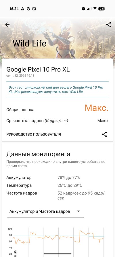 Платформа тут не самая мощная, Tensor G5 где-то в два раза уступает по производительности Qualcomm Snapdragon 8 Elite, установленной во флагманах большинства других производителей, тем не менее ее вполне хватает для того, чтобы 3D-игры шли здесь на максимальных настройках качества.