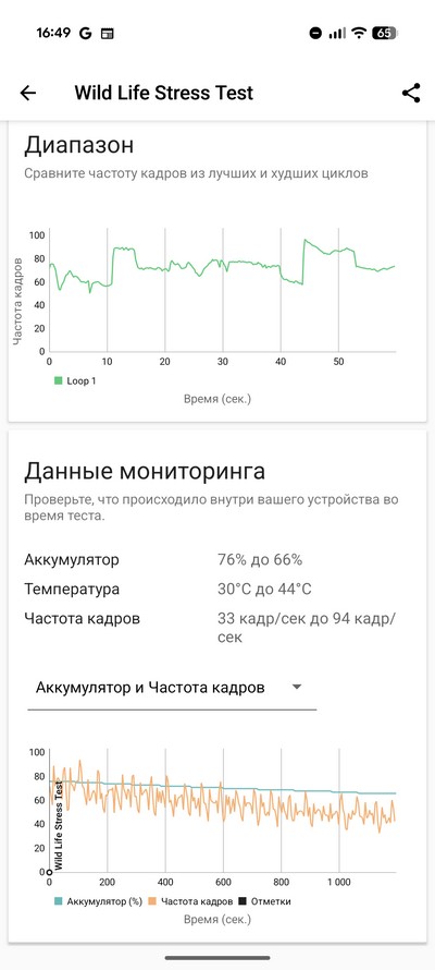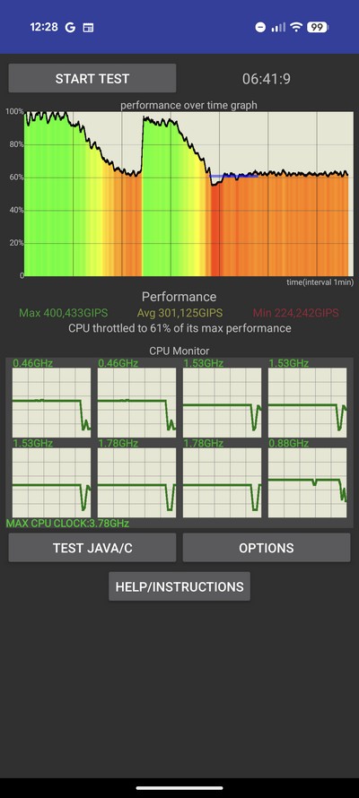 Тест на троттлинг при нагрузке. Ну, в общем, вполне неплохо. Несмотря на определенные падения на 40%, GIPS на минимуме был 224, а это все равно очень хорошая производительность.
