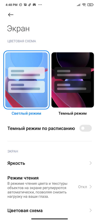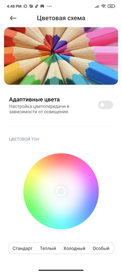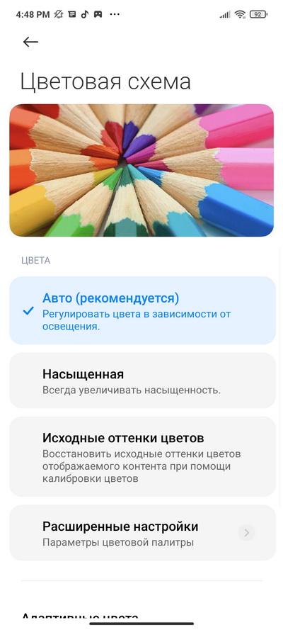Цветовая схема. Адаптивные цвета я пробовал включать - не понравилось: очень часто корректировка делается, цвета "прыгают", раздражает.