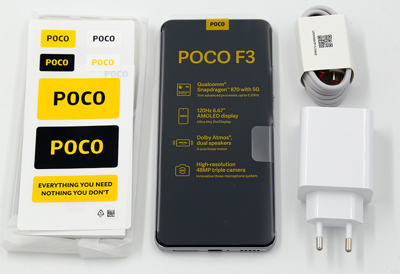 Комплект поставки: смартфон, адаптер питания на 33 ватта, кабель USB - Type-C, инструмент для вытаскивания вставки под сим-карты, силиконовый чехол, переходник Type-C-аудиоджек, инструкция и комплект наклеечек разного стиля оформления, куда также входит наклейка с гордым утверждением "Все, что вам нужно, ничего, что вам не нужно" - это девиз марки Poco. Клеим на холодильник и наслаждаемся.