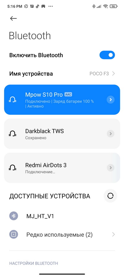 Для проверки беспроводного звучания подключил наушники Mpow S10 Pro. Они подключились по AAC. Звук - отличный: чистенько, очень хорошая детализация, отличные средние и высокие, терпимые (для затычек) басы, отличный запас по громкости - даже в шумном окружении ставил громкость где-то на 75%.