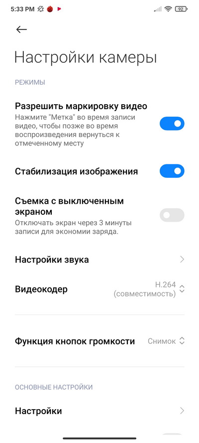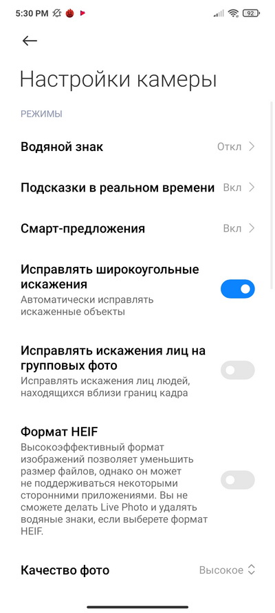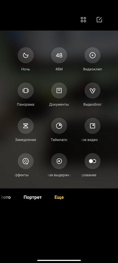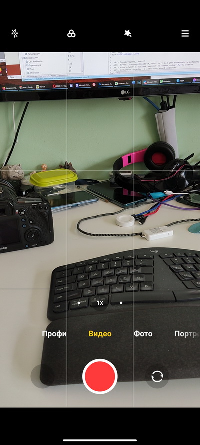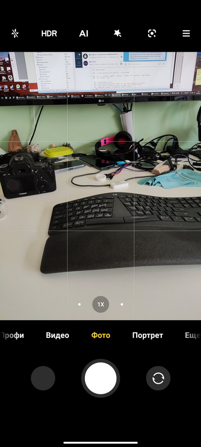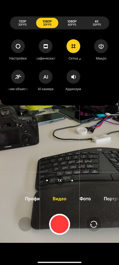 Интерфейс камеры. Снизу переключаются режимы: профи, видео, фото, портрет, еще - их набор настраивается. Выше переключение между сверхшириком, основной камерой и цифровым зумом (по умолчанию 2-кратный, но можно вызвать линейку зумов и масштабировать до 10-кратного). Сверху - пиктограммы различных переключателей и пиктограмма меню.  На правом скриншоте - окно меню с настройками.