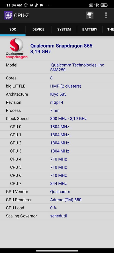 Процессор: Qualcomm Snapdragon 870 5G (7 нм), Octa-core (1x3.2 GHz Kryo 585 & 3x2.42 GHz Kryo 585 & 4x1.80 GHz Kryo 585)